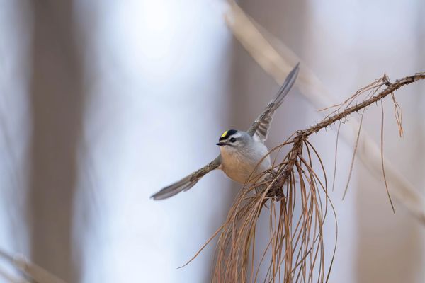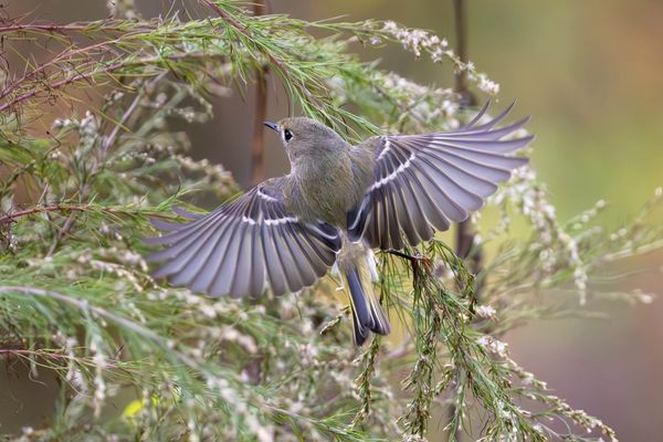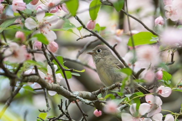 #3A Ruby-crowned Kinglet in a cherry blossom tree