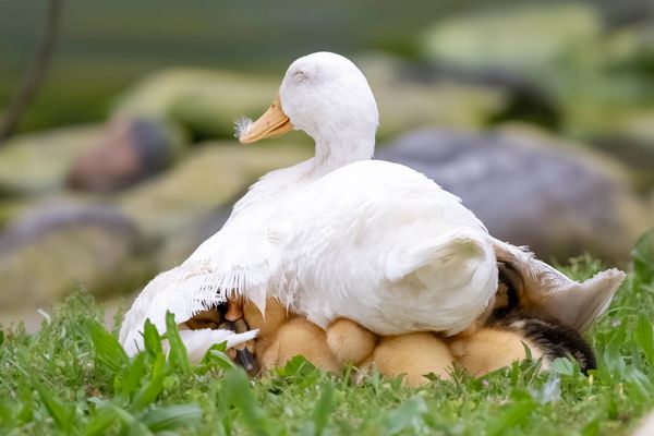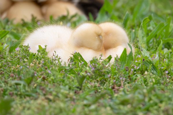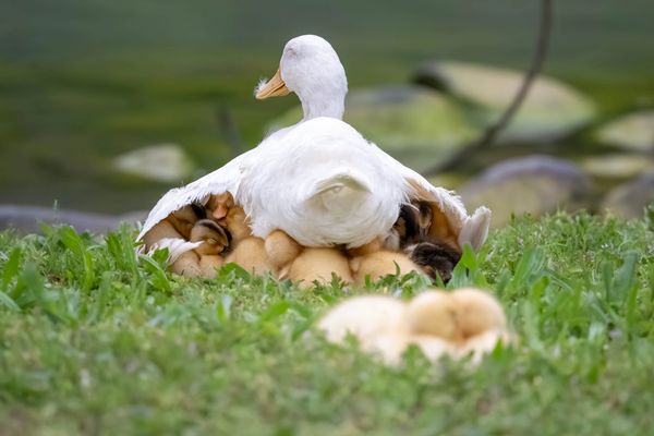 #18A Mama shields her ducklings during a nap as her two larger ducklings nestle nearby